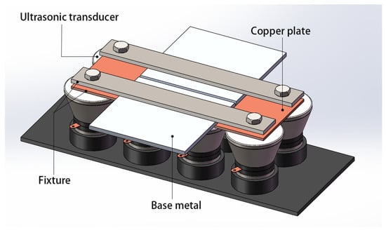 The ultrasonic output powers of 0 W, 160 W, 320 W, 480 W, 640 W, and 800 W were applied to the back of the base metal for welding. The ultrasonic source was eight ultrasonic transducers with the same power connected in parallel to increase the total ultrasonic output power and were synchronously adjusted by the KMD-K1 ultrasonic power supply. The model of the ultrasonic transducer is KMD-28100. The transducer was divided into two layers—upper and lower layers—and the middle was two ceramic vibrating plates. The piezoelectric effect of the ceramic plates converted the electrical energy is into mechanical energy (i.e., ultrasonic wave), and then transmitted the ultrasonic wave through the upper cover. Under the high-frequency AC power supply, high-frequency mechanical vibration can be generated, and the vibration frequency was fixed at 28 kHz. Due to the low attenuation coefficient of ultrasonic waves in copper and the fast heat dissipation rate of copper, the softening effect of thermal cycling on the heat-affected zone was reduced. The ultrasonic vibration was transmitted into the molten pool through the copper pad, and it was used as a fixture to fix the base metal to prevent the deforming of aluminum alloy sheet.