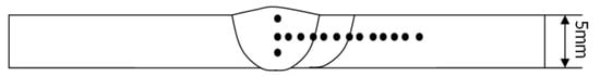 Hardness can reflect the strength of materials. The higher the hardness value of metal materials, the higher the plastic deformation resistance and the higher the strength. Before measurement, the surface of the tested sample was polished with 2000 mesh sandpaper [19,20]. 6061-T6 was subjected to solution strengthening and artificial aging treatment in the production process. Therefore, during the welding process, the welded joint was prone to softening, which often appeared in the weld zone, fusion zone, and heat-affected zone [21]. To reflect the overall hardness distribution of welded joints, the hardness test was carried out along the direction perpendicular to the weld. The schematic diagram of the hardness test points is shown in Figure 2.