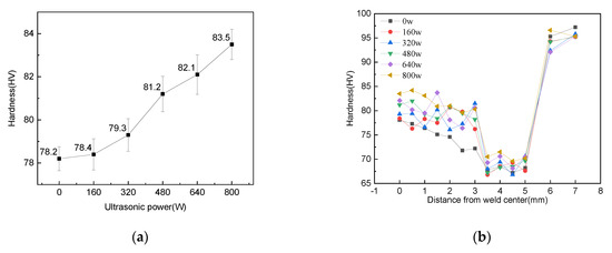 Figure 4a shows the trend of the hardness of welded joints with different ultrasonic powers. The hardness of the weld center almost did not change when the ultrasonic output power was 160 W, and it was 78.4 HV. As the increase of ultrasonic output power, the hardness of the weld center had been increasing. and reached the maximum value of 83.5 HV when the ultrasonic output power was 800 W.