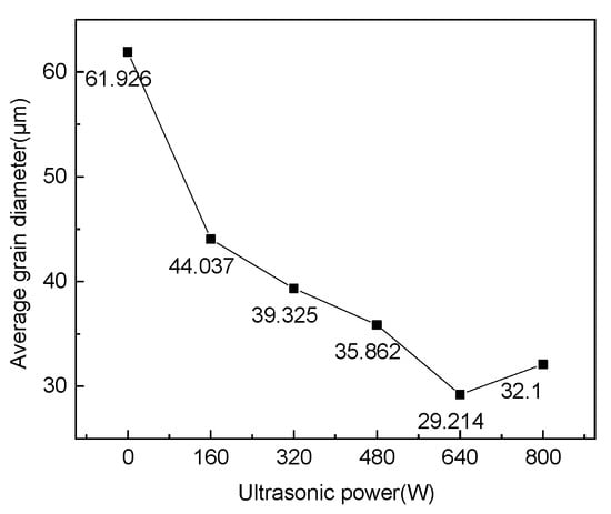 The cavitation bubbles in liquid vibrate under the action of acoustic waves, and the dynamic process of growth and collapse occurs when the acoustic pressure reaches a certain value. The high-speed collapse of these cavitation bubbles will make the surrounding melt generate high temperature and high pressure instantaneously. In this process, the instantaneous temperature and pressure increase the freezing point of the alloy, and accordingly increase the condensate depression of the melt and promote nucleation. In addition, the high temperature generated by cavitation will also make the grains fuse and increase the number of nucleation cores, thus increasing the number of grains. It may also be that strong acoustic waves break up the primary crystal and growing nucleus, thereby inhibiting the growth of grains [28].