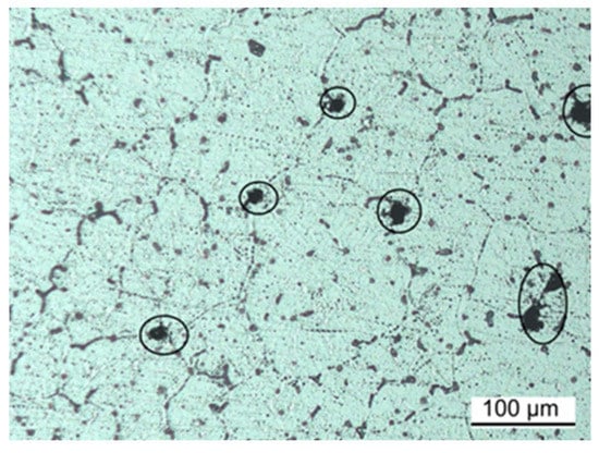 However, the binding force between liquid molecules is very strong. The spontaneous nucleation process of cavitation nuclei generated by ultrasound usually requires large energy, the cavitation threshold is high, and the cavitation effect rarely occurs in theory. In fact, pores are easy to occur during aluminum alloy welding. As shown in Figure 6, there are many small bubbles and impurities in the molten pool, the continuity of the liquid is destroyed, and the bubbles themselves can also be used as cavitation nuclei, resulting in a greatly reduced cavitation threshold in the molten pool. Cavitation can occur under the ultrasonic action of relatively small energy [26,27].