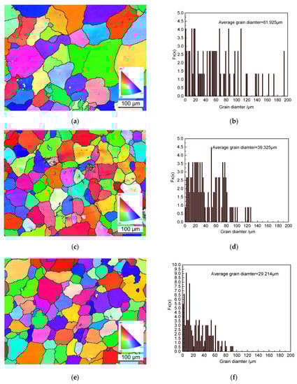 Figure 7 shows the grain structure by EBSD and the proportion of different grain sizes at different ultrasonic powers. When ultrasonic vibration with power of 320 W was added in the welding process, there are basically no large grains in the weld center with no ultrasonic, and there is rather nucleation of new smaller grain and deformation for others under the ultrasonic vibration. When the ultrasonic power reaches 640 W, the proportion of smaller grains is larger, the weld metal mean grain size could be reduced significantly from ~61.926 μm to a saturated size of 29.214 μm, which is only 47.176% when ultrasonic vibration is not applied. When the ultrasonic power continues to increase to 800 W, the average grain size does not continue to decrease, but the weld center is still small, and the grain accounts for a large proportion.