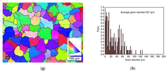 The grain structure by EBSD and the proportion of different grain sizes at different ultrasonic powers. (a) Grain structure by EBSD (P = 0 W). (b) Proportion of different grain sizes (P = 0 W). (c) Grain structure by EBSD (P = 320 W). (d) Proportion of different grain sizes (P = 320 W). (e) Grain structure by EBSD (P = 640 W). (f) Proportion of different grain sizes (P = 640 W). (g) Grain structure by EBSD (P = 800 W). (h) Proportion of different grain sizes (P = 800 W).