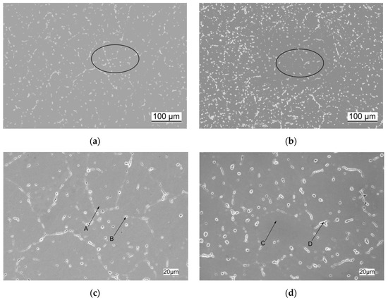 Figure 8 is SEM analysis of ER5356 Al-Mg welded joint weld. Comparing the SEM and EDS of the matrix and precipitates of ER5356 welded joint before and after ultrasonic vibration, it was found that the types of precipitates in the weld do not change, but their distribution is affected by ultrasonic vibration. The specimen with ultrasonic output power of 800 W was selected for analysis. Figure 8a is the SEM image of the weld zone of the welded joint without ultrasonic vibration. After analyzing the image, it can be seen that most of the precipitates in the weld are distributed along the grain boundary. Figure 8b is the SEM image of the weld area of the welded joint after applying 800 W ultrasonic vibration. Compared with Figure 8a, it can be seen that the precipitates in the weld are more evenly distributed. Under the action of ultrasonic vibration, the precipitates are no longer biased at the grain boundary and redistributed.