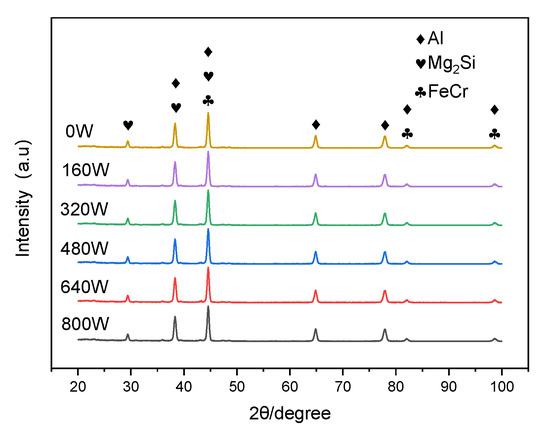 The phase composition of 6061 aluminum alloy weld was measured by X-ray as shown in Figure 9. The elements in the weld area did not change before and after ultrasonic vibration. The types of precipitated phases were completely consistent under each ultrasonic powers. The weld zone mainly contained α-Al solid solution, Mg2Si, and FeCr precipitated phases, which was in line with the speculated results in EDS. The Mg element in ER5356 excessively entered the weld through the droplets, supplemented the burning loss of Mg element caused by high temperature and formed Mg2Si strengthening phases with Si element, thus avoiding the formation of cracks in the imbalance between Si and Fe in aluminum alloy. Meanwhile, Cr element can form a small granular Fe-Cr phase with Fe element as reinforcement to avoid the existence of Fe in the weld as needle-like hard and brittle phase, which can reduce the brittleness of the structure.