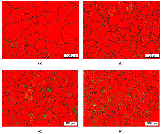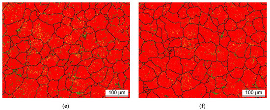 Figure 10 shows the distribution of each precipitated phase in the center of the weld under different ultrasonic power, in which red is α (Al) matrix, yellow is Mg2Si, and green is FeCr. Figure 10a shows the distribution of precipitated phases when ultrasonic vibration is not applied, with few precipitated phases and segregation phenomenon. With the increase in ultrasonic power, the precipitated phases gradually increase; the proportion of each phase under different ultrasonic power is shown in Table 4. A large number of precipitated phases had appeared in the weld center at 320 W, compared with no ultrasonic vibration; Mg2Si increased from 0.18% to 1.23%, and FeCr increased from 1.42% to 4.46%. However, the segregation phenomenon was very obvious, Mg2Si phase was distributed in individual grains, and the FeCr phase is obviously gathered at grain boundaries. With the increase of ultrasonic power, the number of precipitated phases gradually tends to be flat, and they are uniformly distributed in the crystal and grain boundary as finely dispersed particles.