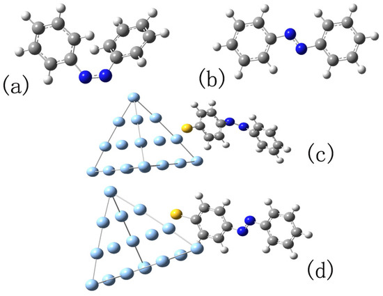 (a,b) The structures of cis and trans configurations of azobenzene molecule, respectively; (c,d) the structures of the complexes in model 2 formed by cis and trans with Ag cluster, respectively. All structures are optimized at B3LYP/6-31G level.