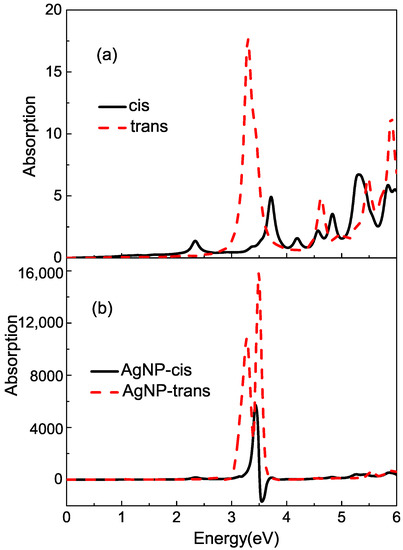 Before adding the effect of NP, we calculate the average absorption across section of isolated azobeneze molecules using the PBE fuction when the propagation direction of incident field is fixed along the axis. As Figure 2a shows, in the range of 0–6 eV, the main excitation of the cis configuration displaces at , , , , and eV; the peak at eV has the maximum intensity. For the isolated trans azobenzene molecule, the optical absorption is stronger than the cis configuration. The first absorption peak at eV calculated theoretically is the strongest peak with a shoulder at about eV. If the damping rate decreases in the calculation, we can find that the shoulder also corresponds to an absorption band. When the azobenzene molecule converts from cis to trans, the optical properties are very different.