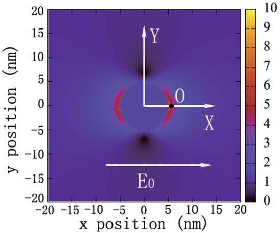 Maxwell’s equations are solved by using the FDTD method within the JFDTD3D package [57]. In our calculations, the light propagation direction is fixed along the axis in all FDTD simulations. A cubic simulation box with a side length of 40 nm and a very small grid size of nm is adopted in order to ensure the convergence of the calculation. Each grid cell is characterized by the value based on its distance to the center of the cubic box that is also the origin of the Cartesian coordination, inside the Ag NP according to the Drude–Lorentz model and in the surrounding medium. Here, is the relative permittivity, is the relative permittivity resulted from the Drude pole, is the bulk plasmon frequency, and is a width factor which includes electron–phonon and other intrinsic electron relaxation mechanisms. The last term describes the relative permittivity arising from each Lorentz oscillator pole. is the shift in relative permittivity at the electron transition at , and is the electron dephasing rate. All the parameters are determined from the experiment [58]. The incident light pulse with the functional form , is injected from the plane at , where fs, fs, and nm. These parameters of incident pulse can make the incident laser pulse cover the visible spectrum from 300 to 800 nm fully. The total simulation time is 100 fs, and the time step is fs. Figure 3 shows the contours of the surface near field of a Ag sphere with R = 5 nm observed in a plane when the incident laser pulse is assumed to have a polarization direction along +x, denoted by the arrow. The properties of SRFs are calculated at the point near the surface of Ag NP and labeled in Figure 3 as the ‘O’ point.