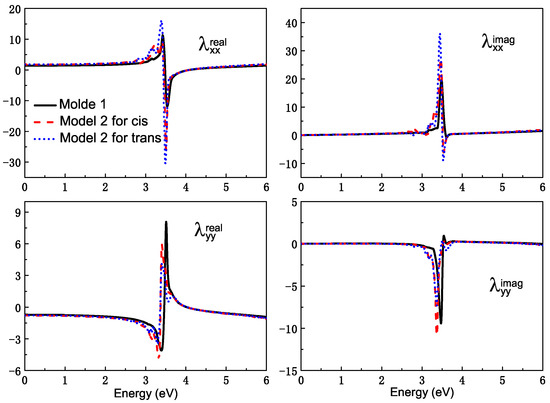 Within the RT-TDDFT theory, the absorption spectra of bound molecule in the proximity of the AgNP can be studied. FDTD simulation about SRFs reflects plasmon enhancement, which is a physical factor for surface-enhanced spectroscopies; the calculation process of RT-TDDFT ensures the consideration of some chemical factor. With an external laser pulse incident, whose propagation direction is fixed along the axis, the field will be strengthened, and the molecule’s light absorption will be changed and improved through plasmonic enhancement. In order to make our theory investigation more common, for a silver-bound cis or trans azobenzene system, two separate RT-TDDFT simulations are carried out with an electric field pulse applied along the x and y axes, respectively, and the average absorption spectra are obtained eventually. By using the SRFs tensor, the with other incident laser pulse is calculated by using Equation (4). For the off-diagonal terms in , nearly negligible compared to the diagonal terms, only and are considered in Equation (4).