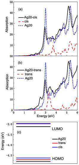 We study the optical properties of the whole complexes using TDDFT with the PBE function that can deal with the interaction between the molecule and metal more exactly. SIC correction is added in order to make the calculation more accurate. The spectra of complexes change considerably, which is not just a superposition of the absorption spectra of azobenzene molecules and Ag clusters. As Figure 5a,b shows, the participation of the Ag cluster makes the shape of the absorption spectra change very dramatically not only from the intensity, but also from the location of the absorption band. Comparing with the absorption spectra of the Ag cluster or azobenzene molecule, they are broad in general and thus represent charge transfer character. Both for Ag20-cis and Ag20-trans complexes, in the high energy region greater than eV, the excitation of azobenzene molecules and Ag clusters are mixed together to form a wide absorption band. In the range of – eV, the shift of absorption band can also be seen very clearly. For example, for the Ag20-cis complex, the absorption peak of the molecule at eV is incorporated with that of the Ag cluster, forming a broad absorption band, which also contains a number of other new excitations for the complex. The peak at eV for the cis molecule red shifts to eV. In addition, some small absorption peaks appear in the low-energy range, and there is a new high absorption peak at eV, which belongs to the excitation of the Ag cluster. The spectral intensity of the complex is much stronger than that of the isolated cis isomer, and the chemical enhancement of metal can be embodied from here. In Figure 5b, the shift and mixture for spectra of the Ag20-trans complex is also obvious. There is an absorption peak belonging to the Ag cluster at eV. The peaks at , and eV are close to each other and form a broad absorption band. There are also some differences compared to the Ag20-cis complex. A new absorption peak appears at eV, which is not found in the spectra of the Ag20-cis complex. The absorption peak at eV for isolated trans azobenzene is replaced by a stronger absorption peak at eV. Figure 5c shows the energy levels of HOMO and LUMO of the Ag20 cluster and azobenzene molecules. We find that for two isomers of azobenzene, their HOMO lie between the HOMO and LUMO of the Ag20 cluster, while the energy of LUMO is higher than that of Ag20, which provides the conditions for the charge transfer during the electron transition.