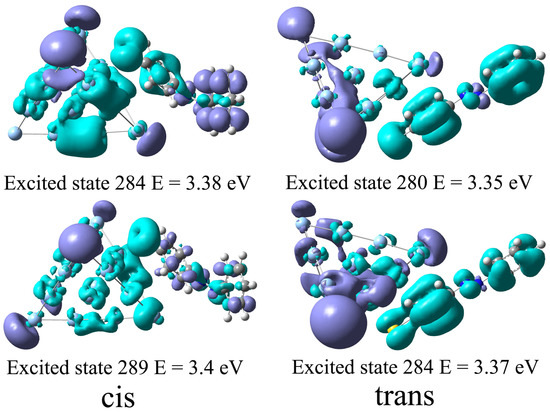 The charge density difference of excited states correspond to the two strong transitions around the eV for Ag20-cis and Ag20-trans complexes, respectively.
