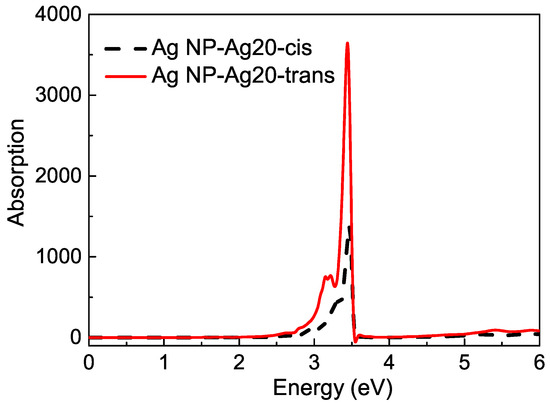 Then, the rest effect of NP is considered. The complex is also fixed on the surface of the Ag nanoparticle, and the Ag20 cluster can be seen as one part of Ag NP. The SRF of the remaining part of Ag NP, which was cut off a regular tetrahedron is also shown in Figure 4. The observation point is set at the mass center of the Ag cluster–azobenzene complex. For the remaining Ag NP, the plasmon mode red shifts a little compared with the intact Ag sphere. The effect of Ag NP is considered by adding the scattering field produced by the rest Ag NP into the TDDFT calculation. Figure 7 is the surfaced-enhanced absorption spectra in model 2. The surface enhancement effect can be found very clearly, especially for the absorption band at about the – eV energy range, which is close to the excitation of the plasmon mode at eV. The absorption enhancement ratio is also sensitive to the energy gap between the molecular excitation and plasmon modes. For the excitation, which is away from plasmon mode, the physical factor, which lies in the enhanced scattering field, is the main reason for enhancement.However, near eV, the energy gap approaches zero, and resonance play a role again. The dual physical and chemical enhancement effects cause the peaks near the plasmon mode to be enhanced much more than the other peaks. So, in Figure 7, for the AgNP-Ag20-cis azobenzene hybrid system, we observe only one strong absorption peak at eV with a shoulder at eV, and the enhancement ratio is about 80 times, compared with the Ag20-cis complex. Although the absorption spectrum of the Ag20-cis complex just has a wide absorption band near eV, the resonance absorption peak becomes strong and sharp. There is a little difference for the trans isomer. Since the charge transfer makes the Ag20-trans complex have an obvious absorption peak at eV, the resonance enhancement is more pronounced for the AgNP-Ag20-trans azobenzene hybrid system, with a resonance absorption peak at eV, which is enhanced by a factor of 167. For the two different isomers, the enhancement for the resonance absorption peak of the trans configuration is more pronounced, and we even found a negative part in the spectra, which is the nonlinear FANO effect, due to the coupling between the molecule and plasmon. Due to the different interactions between the molecule and plasmon, when the structure of the adsorbed molecule converts from cis to trans, the resonance absorption peak also red shifts from to eV. Different chemical effects, including coupling and charge transfer between the Ag and molecule, lead to different enhancement and shifts of the absorption spectra. Photoswitching is still well represented from the surface-enhanced absorption spectra.