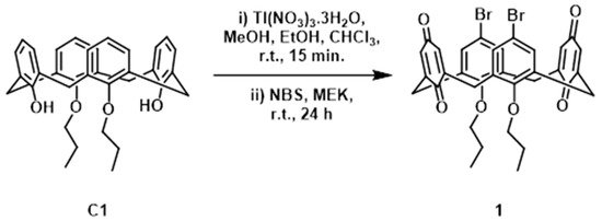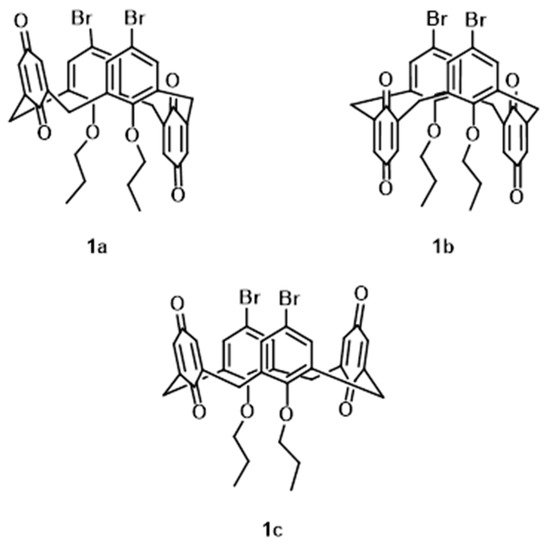 The synthesis of 5,17-dibromo-11,27,23,25-tetraone-26,28-dipropoxycalix[4]arene (1) has been previously achieved as shown in Scheme 1 [2], by oxidation of calix[4]arene C1 to the corresponding p-quinone using thallic nitrate [12,13], followed by bromination using N-bromosuccinimide (NBS) in butanone (MEK) [14]. However, its crystal structure and conformational behaviour in solution has not yet been reported. Herein we describe the crystal structure of 1, the asymmetric unit of which contains two distinct conformations of calix[4]diquinone, the partial cone (1a) and the 1,3-alternate (1b) conformations (Figure 2). This can be contrasted with the solution state where NMR spectroscopic evidence suggests that only a single conformation, the cone conformation (1c), is present.