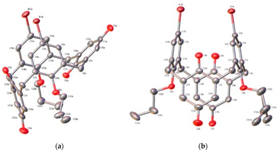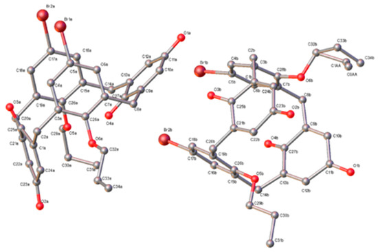 Following this analysis, the Cambridge Structural Database (CSD, Version 5.41, updated March 2020) [30] was searched for diametrically symmetrical calix[4]diquinones. This returned a total of 41 results, of which 29 were metal-calix[4]quinone complexes and lower-rim bridged calix[4]quinones. These are unsuitable for comparison with 1 because the metal binding/lower-rim bridges would dramatically influence the conformational flexibility of the calix[4]quinone. Of the remaining 12 structures, a total of seven hits had simple alkyl chains on the lower rim (NUPHUB, NUPHUB01, PETDOH, PETDUN, PETFAV, VUSNED, and YEHVIQ) [11,20,31,32]. A common structural theme amongst these seven crystal structures and 1 was the deviation of the p-benzoquinone moieties from a perfectly planar structure. Amongst these structures, the prevalent conformation was the partial-cone conformation, however, in each case, only a single conformation was present in the asymmetric unit. The best structural comparison to the 1 is provided by YEHVIQ, which differs structurally in that both bromine atoms are replaced with tert-butyl groups, with only the 1,3-alternate conformation present [20].