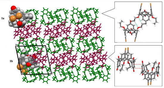 Packing of 1 viewed along the a-axis direction, showing alternating layers of conformers 1a (green) and 1b (maroon). Inset: The intermolecular interactions of adjacent calixarenes within the layers of conformers 1a and 1b.