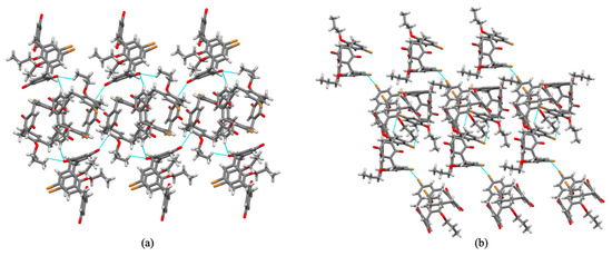 In the extended structure of 1, both the two conformers 1a and 1b pack side by side along the a-axis direction with each independent conformer arranged in alternating layer and belongs to two different packing patterns (Figure 5). A comparable phenomenon was noted for the cyclic alkoxy-organotellurium trihalides where two independent molecules belong to two different packing motifs [25]. The closest contact between molecules of 1a and 1b caused by this arrangement involves strong hydrogen bonding between carbonyl O-atoms with adjacent H-atoms, C=O---HC: O11---H10A = 2.292 Å, O4A---H34E = 2.425 Å; O3A---H34B = 2.516 Å, O2A---H24B = 2.679 Å; O1A and the protons H4B (C-H---O = 2.495(3) Å) and H2BB (C-H---O = 2.892(3) Å). There are also additional interactions between 1a and 1b through interaction of the propyl groups with the carbonyl groups, with the H31B---O3A distance of 2.928(5) Å. Furthermore, there are long range interactions involving the bromine atoms, varying in length from 3.119(3) Å for the Br2B---H14C contact to 4.354(3) Å for the Br1B---H14D interaction. Within the layer comprising conformers 1a, the calixarenes are involved in H-bonding between themselves through the adjacent propoxy chains with C33A-H33D---O6A distance measured at 2.60 Å while for layer comprising conformers 1b, the neighbouring calixarenes are engaged in the offset face-to-face interaction involving the phenyl rings with C---π(centroid) distance at 3.83 Å. In the direction of the a-axis, the extended structure is characterized by molecules of either 1a or 1b packing in an up-down antiparallel bilayer arrangement (Figure 6a,b) which is common for calix[4]arenes. Additionally, some protons are oriented towards the C=C bond plane (plane of the benzene ring) and form CH---π bonds with average distances of 2.75 ± 0.10 Å, coinciding with the CH---π bond distances as reported by Nishio [26].