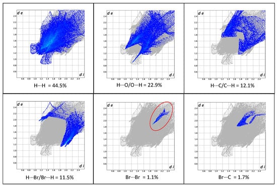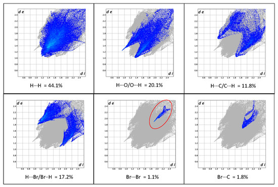 Fingerprint plots for 1b, delineated into H···H, O···H/H···O, C···H/H···C, Br···H/H···Br, Br···Br and Br···C contacts.