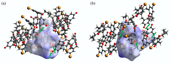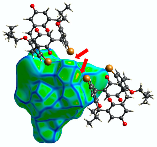 It is noteworthy that Hirshfeld surface analysis is extremely useful for identifying other interactions (notably relatively weaker interactions) apart from the conventional interactions such as C—H···O and C—H···π. We have carefully examined the halogen bond interaction and found that the halogen bond is very closely related to the type-II interaction with θ1 ≈ 92° (C17B−Br2B···Br2A) and θ2 ≈ 160° (C17A−Br2A···Br2B) as a consequence of close packing [27]. We note that although only 1.1% of the surface is assigned to Br···Br contact for both 1a and 1b, a bright streak is still visible at the top right of the fingerprint plot, circled in red in Figure 7 and Figure 8. Interestingly, the presence of Br···Br contact is visible on the Hirshfeld surface when mapped over curvedness (Figure 10). This relatively low percentage solely relates to the proportion of interactions within the crystal structure (given that there is only two Br per molecule, the contribution to the surface will generally be low) and does not reflect the strength of such interaction on the solid-state behavior. The remaining contributions to the Hirshfeld surface are from the Br···C (shortest contact at 3.65 Å for Br1B···C18A) at and O···C (shortest contact at 3.11 Å for O3A···C34B) contacts making up only 1.8% and 3.2% to the surface for 1a while 1.7% and 4.3% for 1b.