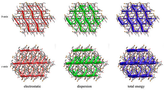 We have also used CrystalExplorer to calculate the intermolecular interaction energies using the CE–HF/3-21G energy model [18] to visualize the interaction topology in the crystal structures. The energy frameworks for electrostatic, dispersion, and total energy components are shown in red, green, and blue colored tubes, as shown in Figure 11. All the frameworks were adjusted to the same cylinder scale factor of 150. The relative strengths of the overall packing interaction energy are indicated by the cylindrical shapes where the radius of the rods is proportional to the magnitude of the interaction energy. The total intermolecular energy is the sum of electrostatic, polarization, dispersion, and exchange-repulsion energies [28] with scale factors of 1.019, 0.651, 0.901, and 0.811, respectively [29]. From the energy framework analysis, we found that the dispersion contribution dominates in the intermolecular interactions. The two alternating calixarene layers of different conformers give the parallel cylindrical tubes when viewed down the c-axis with a larger diameter for the total energy (−89.1 kJ mol−1) and dispersion (−57.0 kJ mol−1) components ascribed for the same type of conformer that self-interact strongly within themselves while the smaller tube diameter intersecting calixarene layers of different conformers illustrates the weaker contribution of the dispersion (−25.8 kJ mol−1) component yielding the total energy of −31.3 kJ mol−1.