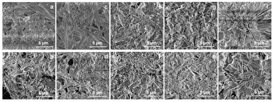 The use of MeOH (Figure 5c,d and Figure S1) and BuOH (Figure 5i,j) had a more prominent effect on the sample morphology than the previously described solvents (Figures S3 and S4). In this case, the samples were also dominated by plate-like crystals, but a trend of long and narrow plate formation was observed. Moreover, more rods were present in the MeOH and BuOH treated samples when compared to the samples prepared in W-EtOH and W-PrOH solutions.