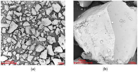The quadripolymer used in this study was milky white dispersion. The scanning electron microscopy (SEM) picture is shown in Figure 1. The microstructure of the quadripolymer had the following characteristic: irregular shapes, different sizes (Figure 1a), and smooth surface (Figure 1b) of the particles were easily recognizable. Among them, the particle size is relatively widely distributed. The largest is around 200 microns and the smallest is just under 10 microns.