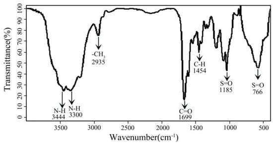 The FT-IR spectrum of the quadripolymer is presented in Figure 2. Moreover, 3444 cm−1 and 3300 cm−1 are assigned to the N-H stretching vibration of AM and AMPS, respectively. The absorbency at 2935 cm−1 results from the characteristic peak of the methyl group. The stretching vibration of C=O at 1699 cm−1 is attributed to AM and AMPS. The absorption peak observed at 1454 cm−1 is due to the C-H bending vibration from DMDAAC unit. Bands recorded at 1185 cm−1 and 1044 cm−1 assigned to S=O stretching vibration in the sulfonic group correspond to SSS unit. The absorption peaks at 766 cm−1 reveal the bending vibration of a benzene ring of the SSS unit.