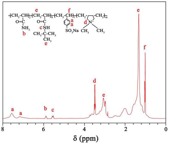The 1H-NMR spectrum of the quadripolymer is shown in Figure 3. Bands recorded at 7.48 ppm (a1) and 7.24 ppm (a2) indicate the chemical shift in the benzene ring of SSS units. The N-H proton from 5.87 to 5.92 ppm (b) are related to AM. The peaks between 5.51 and 5.63 ppm (c) are due to the N-H proton vibration of AMPS. The characteristic peak at 4.79 ppm belongs to the chemical shift of D2O protons. Broad peaks between 3.45 and 3.53 ppm (d) are assigned to N-C proton of DMDAAC. Respectively, the peaks at 2.76 ppm and 1.65 ppm correspond to the chemical shift of –CH2 and –CH3 of AMPS (e). The board peak at 2.93 ppm and 1.45 ppm are related to the -CH- linked with the benzene ring and the main chain of SSS, respectively (f). Combined with the FT-IR spectrum, the quadripolymer molecular structure is consistent with the designed one.