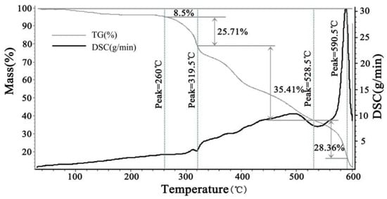 From the TG curve (Figure 4), it can be found that the four stages of the thermal degradation process, first stage, the quadripolymer has 8.5% of mass losses before 260 °C, indicating slightly thermal degradation from chain scissionThe second stage is from 260 °C to 319.5 °C, apparent mass loss of the quadripolymer occurs (27.71%) in the TG curve and the fastest mass loss temperature emerges at 300.5 °C in the DSC curve. The third stage is from 319.5 °C to 528.5 °C, the mass loss declines constantly (35.43%). the release of the non-cyclic anhydrides formation acrylic acid repeat unit or the carboxylic acid pendant group. Moreover, accordingly, there is no significant fluctuation on the DSC curve. The last stage is from 528.5 °C to 600 °C, 28.36% mass is left. This might be due to the thermal degradation of C=C decomposition in the main chain of AM and SSS segments and the breakage of benzene ring in SSS monomers. From the above analysis, the thermal degradation of the quadripolymer is not obvious before 260 °C and only 27.7%, which demonstrates the quadripolymer has strong heat-resistance ability.