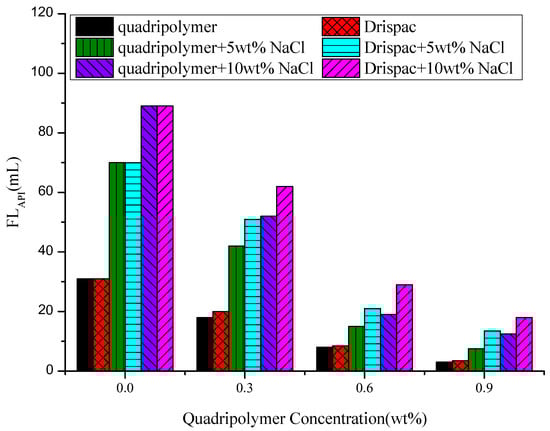 For filtration property, the API filtration (FLAPI) experiments were performed under a pressure of 100 psi and room temperature. The effect of salinity and polymers on filtration performance of bentonite-free drilling fluid is presented in Figure 5.
