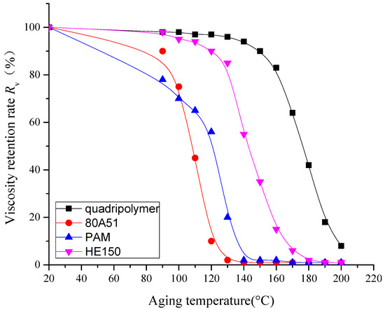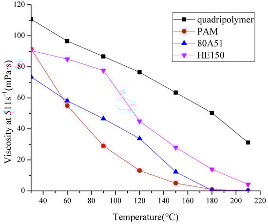 As shown in Figure 6, heating causes the rapid drop in the viscosity of polymer solutions, especially for PAM, 80A51 and HE150. Among the four polymers, the viscosity reduction rates of the three polymers mentioned above are much higher than that of quadripolymer. When temperature rises to 180 °C, the viscosities of the PAM and 80A51 solution are close to 0. In contrast, the quadripolymer has higher viscosity values at each temperature point than those of the other three polymers in the temperature range of 200 °C, which further suggests that the quadripolymer has good temperature resistance at high temperatures.