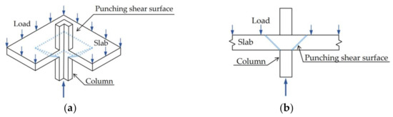 Fiber reinforced polymer (FRP) is a material which has many advantages such as light, high strength and corrosion resistance. In a corrosion environment, to solve the problem of short actual service life of structure, FRP bar can be applied as an alternative to steel bars in concrete structures. This is because FRP bar can be appropriate for service demands of concrete structure in severe environments which contain plenty of chloride ion and sulfate ion. However, FRP bar has a low elastic modulus, which will result in FRP reinforced concrete slabs being more prone to punching failure than reinforced slabs (Figure 1). Many experimental studies show that [6,7,8,9,10,11] under the same conditions, the punching shear strength and stiffness of the cracked FRP reinforced concrete slabs decrease faster than reinforced concrete slabs. Matthys and Taerwe [6] concluded that the crack development of slabs and brittleness of punching failure were significantly affected by the bond performance of FRP grid reinforcement through experimental results. The experimental results of Ospina et al. [7] indicated that the bond behavior between FRP bar and concrete have a significant impact on punching shear capacity of FRP reinforced concrete slabs. It is shown that the slab thickness and the concrete compressive strength were of considerable influence on the punching shear capacities of FRP reinforced concrete slabs by Bouguerra et al. [9]. Ramzy et al. [12] reported that the punching shear behavior of flat slab was related to the size effect of construction and the Young’s modulus of FRP reinforcement.