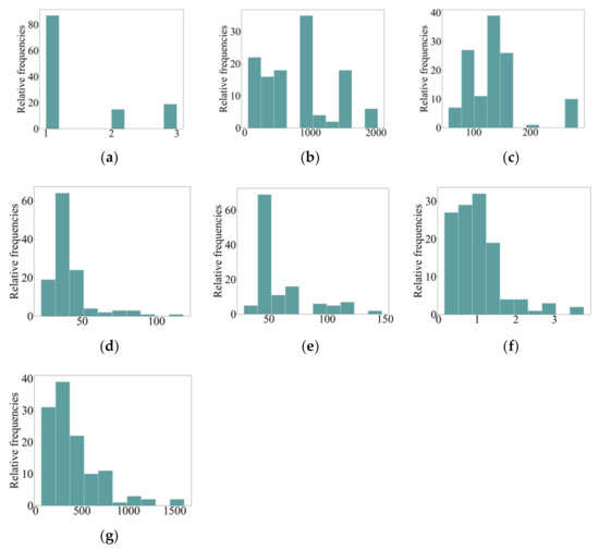 Histograms of input and output variables. (a) x1; (b) x2; (c) x3; (d) x4; (e) x5; (f) x6; (g) y.