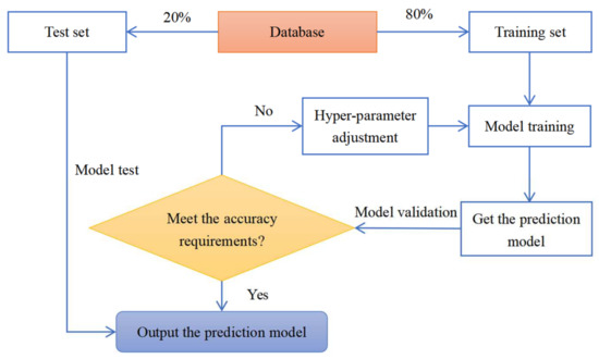Generally, the implementation of machine learning has four stages: (a) divide the database into training set and test set; (b) apply the training set to model training; (c) check whether the accuracy requirements are met; d) output the predicted model for test or adjust the values of hyper-parameters. The flowchart for this procedure is shown as Figure 3. A total of 4 machine learning models, namely, ANN, SVM, DT and Adaboost, are selected in this study. As for ANN, an input layer, hidden layers and an output layer are formed for the predicted results, where several neurons are applied. As for SVM, a prediction equation is formed based on the predicted output in which the error should be smaller than a fixed value. As for DT, the whole database is separated into tree-like decisions which are based on one or several input characteristics, and the output is the tree which falls into the data. As for the AdaBoost, a group of weak learners are collected to form a strong learner which achieves better predicted results. Notably, the predicted performance of model has relations with the value of hyper-parameters. Therefore, in this paper, some methods will be selected to better determine the value of hyper-parameters.