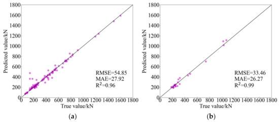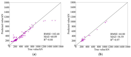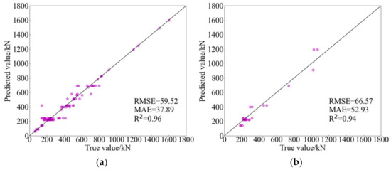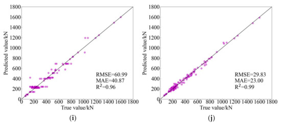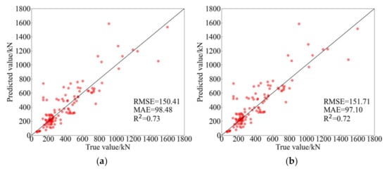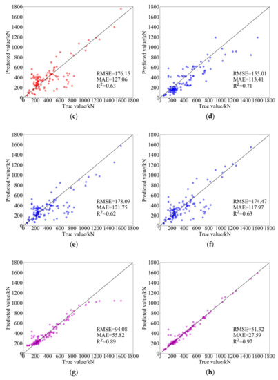 Table 5 summaries experimental results of machine learning models and traditional models. Obviously, the predicted performance of AdaBoost is better than other predicted models reflected in RMSE, MAE and R2. ANN, DT and PSO-SVR, the other three AI models, although their predicted results are not best, they show a better performance compared with traditional empirical models. Among these traditional models, Formula (1) (GB 50010-2010 (2015)) has the highest predicted accuracy, the RMSE, MAE and R2 of which are 150.41, 98.48 and 0.73, respectively. Notably, the predictions between Formulas (1) and (2) only has a little error; perhaps it is related to the fact that they are both derived from the eccentric shear stress model [14,69]. In addition, the forecasting performance of the model proposed by El-Ghandour et al. is better than the other traditional models proposed by other researchers. In brief, the RMSE and MAE of traditional empirical models are generally greater than 100, and the R2 of them ranged from 0.6 to 0.8. However, the RMSE and MAE of machine learning models are less than 100, and the R2 of them are generally greater than 0.9 and even close to 1.0. Consequently, it can be said that the difference in the predicted accuracy between traditional empirical models and machine learning models is obvious.