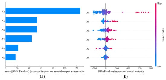 According to the experimental results obtained above, the predicted results of AdaBoost, which has the best predicted performance, was explained. The predicted results of AdaBoost can be interpreted by SHAP in different ways. Firstly, the feature importance analysis of input parameters is shown in Figure 9a. It can be seen that the importance of each input parameter is non-negligible, that is each input parameter will have a different degree of influence on the predicted results. This is consistent with the existing experimental conclusions [4,72]. According to the analysis results, it can be understood that the SHAP value of each parameter are x1 equals 53.45, x2 equals 44.50, x3 equals 126.36, x4 equals 21.57, x5 equals 17.23, x6 equals 52.96, respectively. Obviously, the slab’s effective depth (x3) has the most critical influence on the punching shear capacity, more than twice as much as types of column section (x1). Moreover, though the Young’s modulus of FRP reinforcement (x5) has the least importance on the predicted results, sometimes ignoring this feature will cause unnecessary errors in the predicted results of model. Consequently, using these 6 features as the input parameters of machine learning algorithm is reasonable.