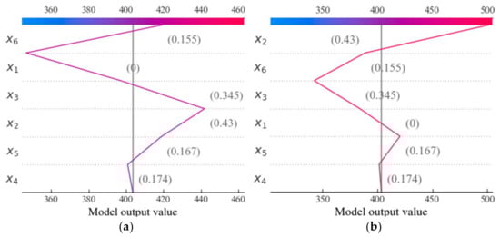 Except the global interpretations, SHAP also can provides the individual interpretation for each sample in the dataset. In this study, 2 samples are selected, the predicted process of which are illustrated as Figure 10. In the figure, the gray line represents the baseline value, which equals 403.62, and the colorful lines represents the decisive process of each feature. In Figure 10, it can be seen that from the baseline value, every feature will change the value to a different degree, and finally predicted values 419.27 and 501.00, respectively, will be obtained. In the predicted process of the 2 samples, types of column section (x1), slab’s effective depth (x3), the compressive strength of concrete (x4) have negative influence on predicted results; whereas, the cross-section area of column (x2), Young’s modulus of FRP reinforcement (x5), reinforcement ratio (x6) have positive influence on it. Furthermore, reinforcement ratio (x6) acts as determinant in forecasting process of sample 1, and the cross-section area of column (x2) plays an essential role in sample 2. In summary, both the global interpretations and the individual interpretations give a detailed insight into the process by which each input feature affects the final predicted value.