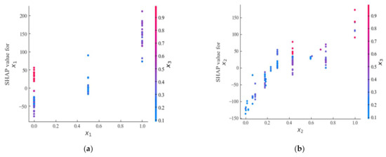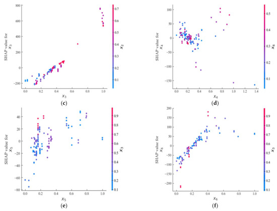 In addition to explaining the predicted mechanism of model, SHAP can also reveal the interaction between the specific feature and its most closely related feature, which is shown in Figure 11. It can be seen from the Figure that with the values increasing of x1, x2, x3, x6, their SHAP values will also be increasing, but the relationships between x4, x5 and their SHAP values are complicated and nonlinear. As the values of x4, x5 increase, the SHAP values of them will increase or decrease; thus, it is difficult to describe the concrete relationships. However, the one that interacts most closely with x1, x2, x5, x6 is x3, the features most closely related to x3 and x4 are x2 and x6, respectively. According to the results of feature dependency, further experiments can be carried out to analyze the relationship between the two variables that interact most closely, and analyze the collaborative impact of these two variables to output. It might be helpful to improve the punching shear resistance of FRP reinforced concrete slab-column connections, and the traditional empirical models cannot accomplish this because the traditional models, relatively, have the worse predicted performance.