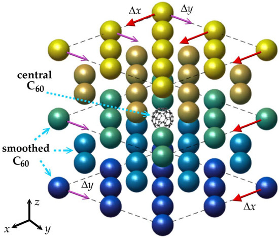 A fullerite fragment consisting of 63 fullerene molecules is considered (see Figure 1). At room temperature, the C60 molecules form a face-centered cubic lattice with a lattice parameter of d = 1.417 nm [38]. A fragment of the fcc crystal structure is a cube, the opposite faces of which are at a distance of 2d. The central fullerene molecule is composed of 60 carbon atoms (C60, 720 am). The dynamic state of the central molecule is determined by the nature of the interaction with all surrounding fullerenes. Therefore, it plays a special role in the presented model. The remaining 62 molecules are modeled as spherical particles. At the initial moment of time, the distance between the centers of the two nearest molecules is around 1.002 nm [38,39]. The interaction of the central molecule with smoothed C60 is described using interatomic interaction potentials based on the Lennard–Jones potential [40,41]. Thus, in this article, the interaction of any carbon atom of the central fullerene with any smoothed fullerene depends only on their mutual position but does not depend on the position of any other particles, as in many-particle potentials [42,43,44]. At a certain point in time, a fullerite fragment is deformed by moving a group of molecules towards the central fullerene at a given speed. For simplicity, we do not take into account the influence of intramolecular vibrational modes, i.e., the central molecule is a set of material points (atoms) rigidly interconnected. With this assumption in mind, the central molecule has three degrees of freedom of translational motion and three degrees of freedom of rotational motion.