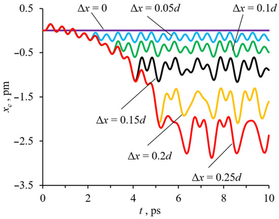 Figure 3 shows the curves corresponding to the displacement of these molecules by a distance Δx in the range from 0 to 0.25d. Changes in other coordinates of the center of mass are not given because in this case, there is a rectilinear motion of the central molecule. As can be seen from Figure 3, the stronger the indentation deformation of the crystalline fragment along the x-axis (x-deformation), the stronger the average deviation of the central molecule from its initial position and the greater the amplitude of oscillations relative to the average position.