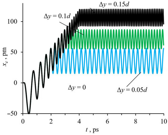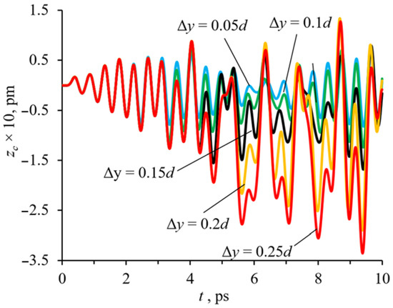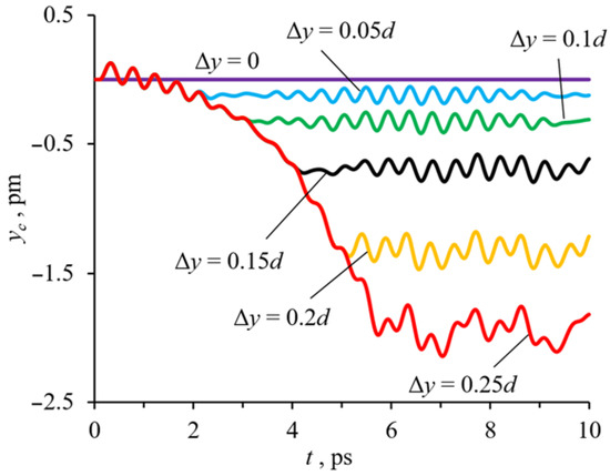 Let the deformation be directed along the y-axis (Δy > 0, Δx = Δz = 0) (y-deformation), i.e., vdef (purple arrow in Figure 1) perpendicular to the angular velocity of rotation. Then the displacement of the central fullerene is described in Figure 5. It can be seen that the change in the y-coordinate in Figure 5 is similar to the change in the x-coordinate in Figure 3. However, as can be seen from Figure 5, the y-deformation causes a smaller displacement of the central fullerene than the x-deformation since the y-deformation leads to a qualitative change in the dynamics of the movement of the central fullerene. The central fullerene settles into yavg = −0.12, −0.69, −1.94 pm with Amax = 0.07, 0.11, 0.2 pm at Δy = 0.05d, 0.15d, 0.25d, respectively. The average positions along the deformation axis decreased by 16.9–18.6%, and the maximum amplitude Amax decreased by 40.8–67.2% compared to the x-strain (Figure 3).