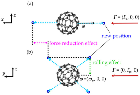 The effects of rolling and force reduction are shown schematically in Figure 7. Figure 7a describes the rectilinear motion that occurs when the angular velocity ω and the force F lie on the same straight line passing through the center of mass of the C60 molecule or when ω = 0. Figure 7b schematically shows the motion that occurs when the angular velocity ω and the force F are perpendicular vectors. We can see the effects of the angular velocity direction because we used the hybrid discrete-continuous mathematical model. The calculation results show that the models of smoothed molecules [40,41,47,48] applied to all fullerenes, including the central fullerene, will give a qualitatively incorrect result when the axis of rotation does not coincide with the direction of deformation (see Figure 7). Because the rotation of fullerenes is not present in these models (ω = 0). Thus, there will be no movement of fullerenes along the z-axis under the conditions of the computational experiment presented in this article (see Figure 7). At the same time, these models are useful for quick calculations and for isolating the various physical effects from high-frequency oscillations.