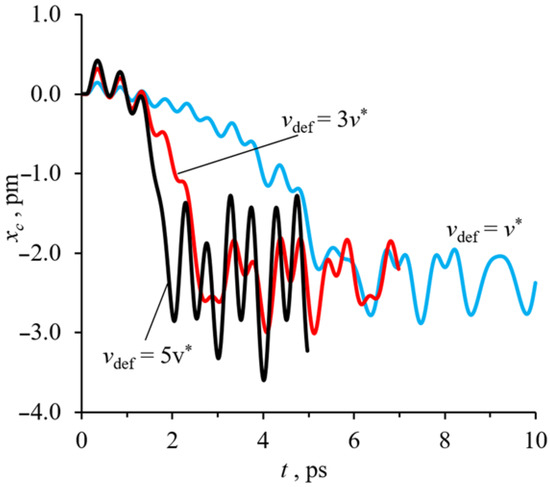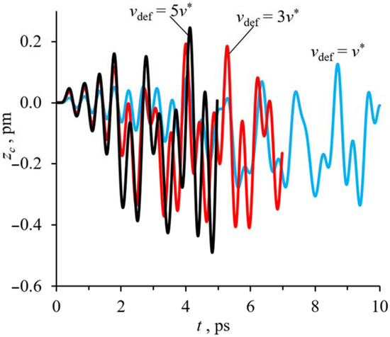 Let the outer row of molecules move in the positive x-direction for a distance Δx = 0.25d with a velocity vdef that varies from 1v* to 5v*. As can be seen from Figure 8, the greater the strain rate, the greater the amplitude of the oscillation. The calculation of the mean value of the x(t) function shows that at Δx = 0.25d the center of the central fullerene shifts to the position xavg = 2.33 ± 0.01 pm for any value of vdef. However, the maximum amplitudes Amax are 0.54, 0.7, 1.28 pm for strain rates vdef = 1v*, 3v*, 5v*, respectively. This suggests that higher values of the strain rate increase the effect on the central fullerene and, consequently, on the fullerite fragment.