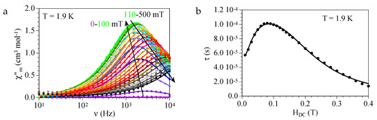 The fit of the frequency dependence to the Debye model (Equation (1), solid lines in Figure 4a) yields relaxation times (τ) that, as expected, show an initial increase when the DC field increases from 0 to ca. 100 mT and a decrease for higher DC values (Figure 4b).