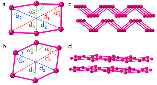 Besides the coordination geometry, the change in the coordination number leads to a change in the symmetry of the lattice, which passes from a monoclinic P21/n space group in phase I (compounds 1–8) to a triclinic P-1 space group in phase II (compounds 9–13). This change reflects the different spatial dispositions of the three chloranilato ligands in both phases (Figure 6b,c). The different orientation of the anilato bridges leads to the above indicated disposition of the anilato rings with respect to the plane of the ring in phase I (four anilato rings of the type edge-on, EO and two face-on, FO, Figure 3b). In contrast, in phase II, the disposition of the anilato rings in the opposite: four FO and two EO [32,37]. Although both phases present the same 6,3-gon topology, the different spatial orientations of the chloranilato ligands lead to differences in two important structural features: (i) the geometry of the 6-membered rings (distorted rectangles, in phase I, Figure 7a, vs. distorted hexagons in phase II, Figure 7b) and (ii) the planarity of the layers (very corrugated layers in phase I, Figure 7c, but almost flat layers in phase II, Figure 7d).