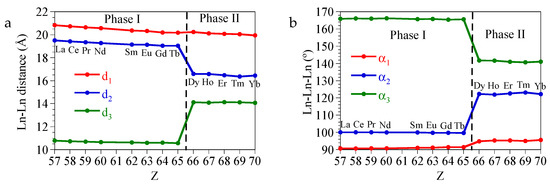 As can be seen in Figure 9a, both values show a slight decrease as we move forward in the lanthanoids series, due to the decrease in the ionic radii. As expected, both values are much higher in phase I (La–Tb) than in phase II (Dy–Yb), confirming the much important deviations from the regular hexagon for the rings in phase I. An additional effect of the decrease in the ionic radii along the Ln(III) series is the reduction of the SHAPE parameters for both coordination geometries (Figure 9b).