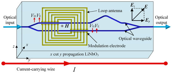 As shown in Figure 2, with the magnetic field H penetrating perpendicularly into the aperture of the loop-antenna, an electric field E = (Ez, Ey) perpendicular to H appears on the electrode. Thus, the same voltage VEz induced by Ez appears on both the right and left electrode, while the voltage VEy induced by Ey does not modulate the lightwave travelling through the optical waveguide (TE mode, polarized along the z axis). Thus, the phase difference of the lightwave travelling through the two arms of the optical waveguide MZI can be written as