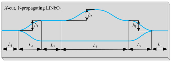 Under the condition of the practical fabrication process, length, width, and thickness of the used LN substrate are 50,000 μm, 4100 μm, and 500 μm, respectively. Length of the input and output waveguide L1 is designed as 5000 μm to ensure the fiber coupled input light beam can form a stabilized transmission mode before it is split in the Y branch. Besides, the length and height of the Y branch L2 and h2 are designed as 1500 μm and 11 μm to decrease the bend loss and simultaneously avoid the optical coupling between the two arms of the Y branch. As a result, L3 is designed as 4000 μm.