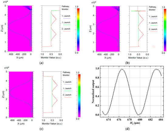 Transmission characteristics of the optical waveguide AMZI: (a) H2 = 673.5 μm; (b) H2 = 675.1 μm; (c) H2 = 676.5 μm; (d) normalized output under different h2.