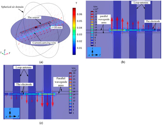 With the aforementioned parameters, the loop-antenna, segmented electrode, and optical waveguide AMZI are established on an LN substrate with dimensions of 48 × 3 × 0.5 mm3 based on the COMSOL MULITI-PHYSICS. The magnetic field module is used to generate a sinusoidal current with amplitude of 50 A on the current-carrying wire. Considering the distance between the sensor package edge and the LN substrate center is about 7 mm and thickness of the package edge is 2 mm, the distance away from the current-carrying wire to the center of the loop-antenna is designed as r = 10 mm to generate larger magnetic induction. As a result, the larger magnetic flux is generated by the loop-antenna and larger induced voltage is generated on the segmented electrode, yielding a higher measurement sensitivity. The magnetic field distributions are simulated and shown in Figure 6a. As can be seen, the magnetic field is mainly concentrated around the current carrying-wire. Moreover, Figure 6b,c shows the electric field distributions on the left and right segmented electrode, respectively. As can be seen, the induced electric field on the outer electrode (connecting with the outer loop of the multi-loop-antenna) is obviously larger than that on the inner electrode. This comes from the fact that the area of the outer loop-antenna is larger, which results in a larger magnetic flux. The electric field on the left electrode (across the upper optical waveguide of the two parallel waveguide arms) is along the +z direction, while the electric field on the right electrode (across the lower optical waveguide of the two parallel waveguide arms) is along the −z direction. Therefore, a push–pull modulation is generated by the magnetic-field-induced differential voltage.